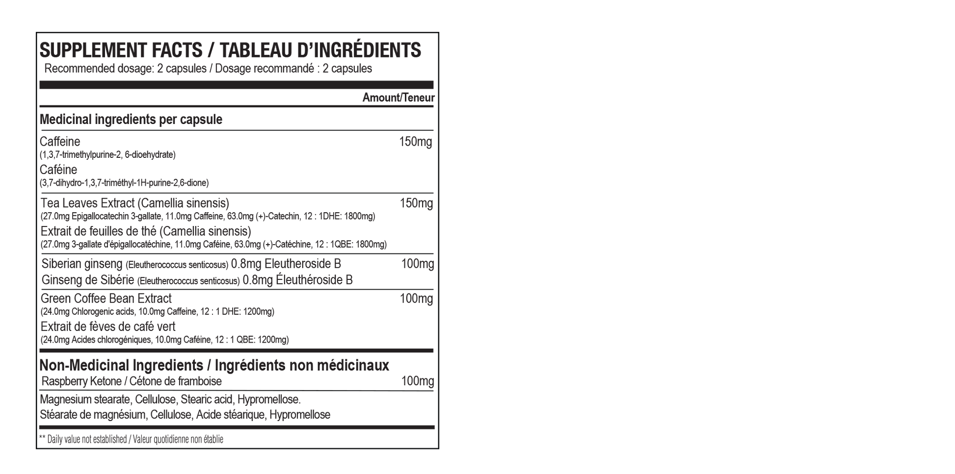 Consult a health care practitioner prior to use in case of high blood pressure. Consult a health care practitioner prior to consuming more than 300 mg of caffeine if you are of childbearing age, pregnant or breastfeeding. It is not recommended to consume this product with natural health products (eg bitter orange extract, synephrine, octopamine, ephedra) that increase blood pressure. Consult a health care practitioner prior to use if you are taking lithium. It is not recommended to consume this product with other products that contain caffeine (medication, coffee, tea, colas, cocoa, guarana, mate). This product is not intended to replace sleep. If you suffer from liver disorders, consult a health care practitioner prior to use. Discontinue use if you develop symptoms of liver problems such as yellowing of the skin/eyes (jaundice), stomach pain, dark urine, sweating, nausea, unusual tiredness and/or loss of appetite and consult a health care practitioner. Consult a health care practitioner prior to use if you have an iron deficiency. Consult a health care practitioner if symptoms worsen. Consult a health care practitioner prior to use if you have an acute infection.