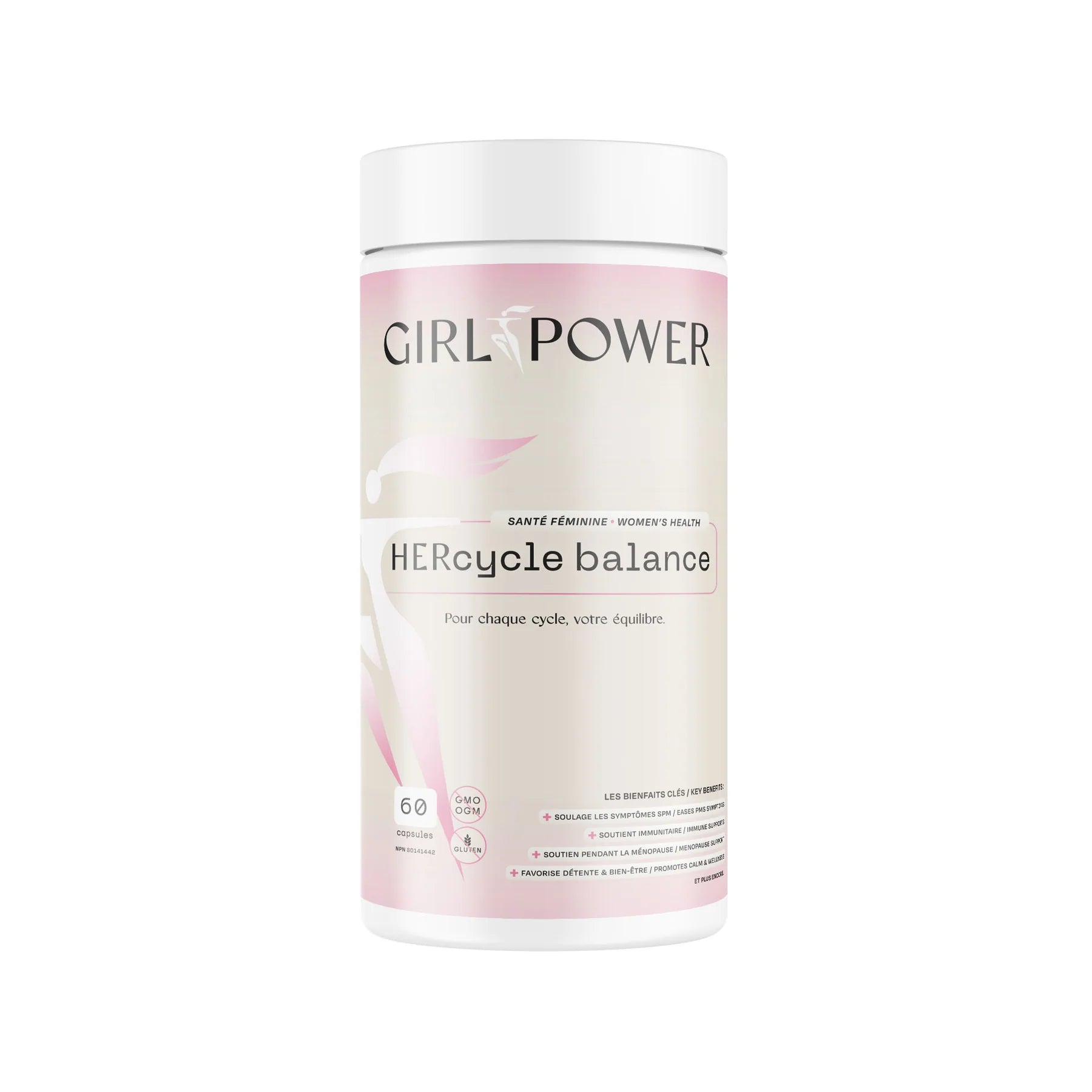 HERCYCLE BALANCE de Girl Power est un supplément spécialement conçu pour soutenir les femmes à chaque phase de leur cycle menstruel. Il aide à favoriser l’équilibre hormonal, réduire l’inconfort lié au cycle et soutenir le bien-être physique et émotionnel au quotidien.
